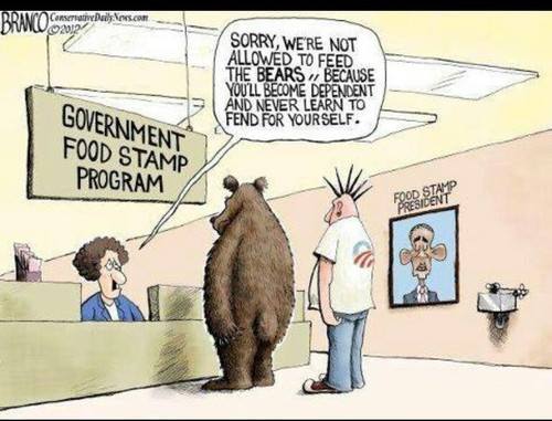 Government food stamp program – Sorry, we’re not allowed to feed the bears… because you’ll become dependent and never learn to fend for yourself.