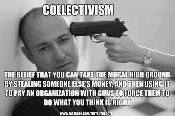 Collectivism – the belief that you can take the moral high ground by stealing someone else’s money, and then using it to pay an organization with guns to force them to do what you think is right.