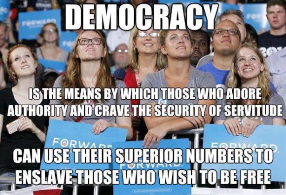 Democracy is the means by which those who adore authority and crave the security of servitude can use their superior numbers to enslave those who wish to be free.