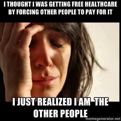 I thought I was getting free health care by forcing other people to pay for it… I just realized I am the other people.