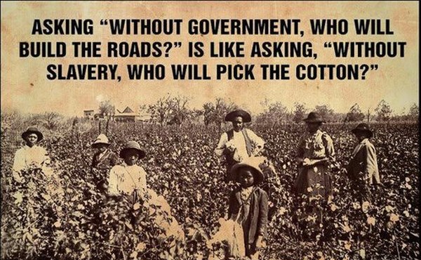 Asking “Without government, who will build the roads?” is like asking, “without slavery, who will pick the cotton?”