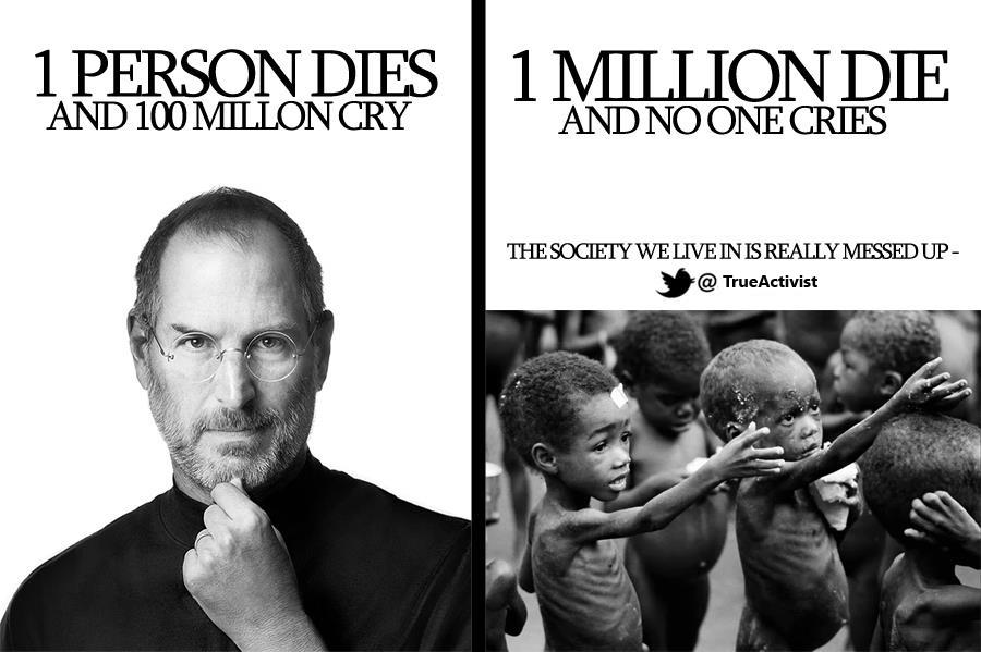 1 person dies and a million cry. 1 million die and no one cries. The society we live in is really messed up