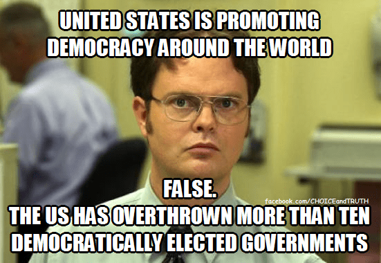 Dwight – US is promoting democracy around the world. False. The US has overthrown more than ten democratically elected governments