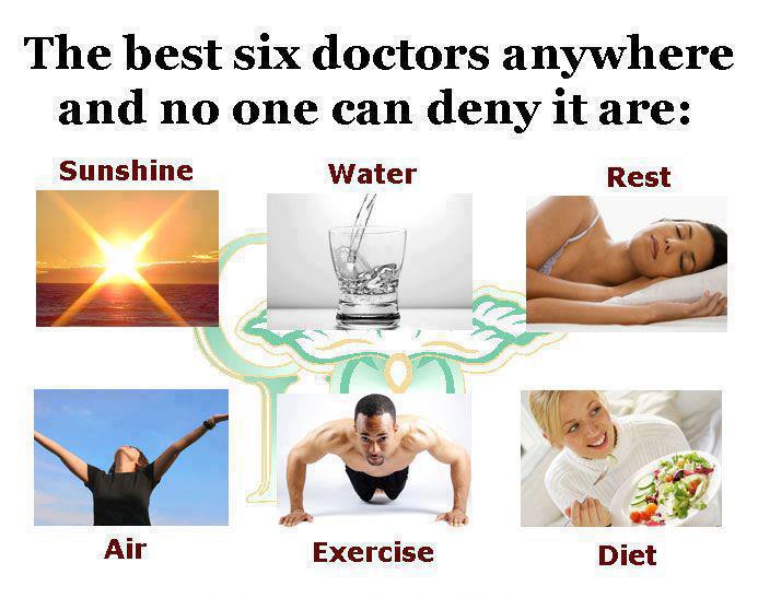 The best six doctors anywhere and no one can deny it are – Sunshine, Water, Rest, Air, Exercise, Diet