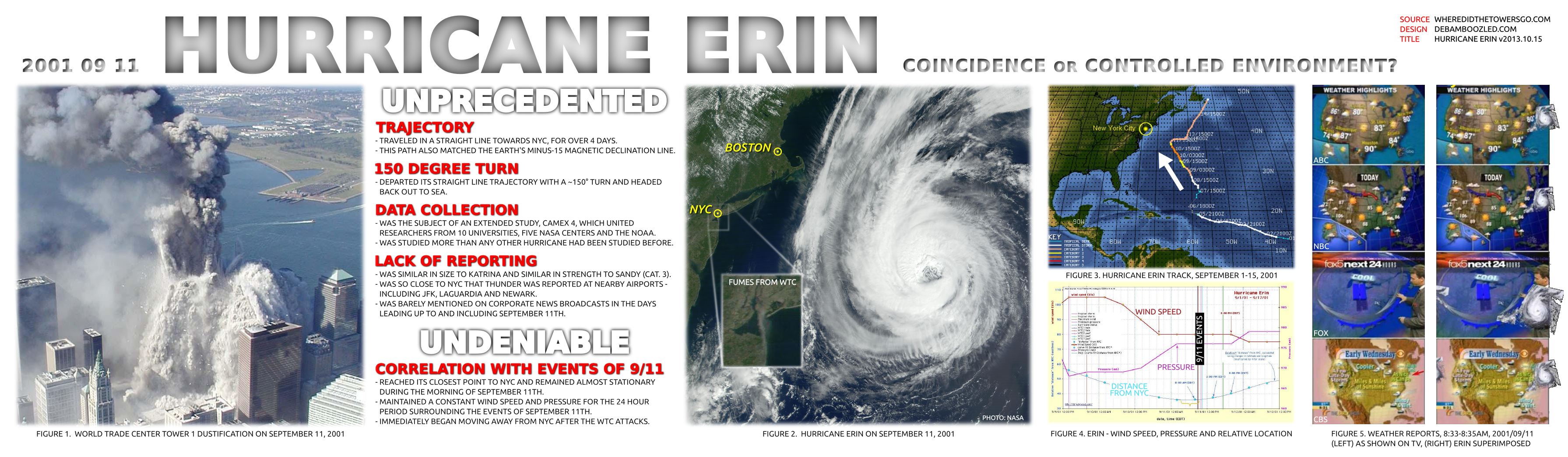 Keeping a hurricane a secret is a sizeable swindle in and of itself, but to be able to keep the public from knowing about a category 3, just miles outside New York City, is nothing less than Orwellian. Even more unthinkable, is the fact that Hurricane Erin’s movements are highly correlated to the single most historic day of our time… 9/11.