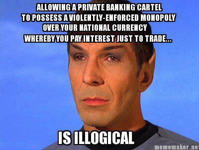 Allowing a private banking cartel to possess a violently-enforced monopoly over your national currency whereby you pay interest just to trade… is Illogical.