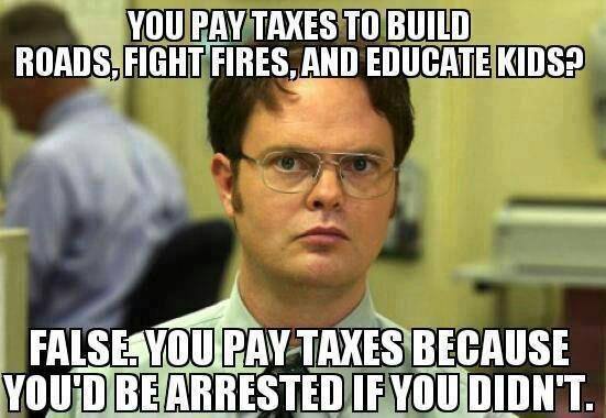 You pay taxes to build roads, fight fires, and educate kids? False. You pay taxes because you’d be arrested if you didn’t.