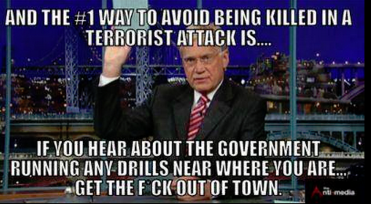 And the number 1 way to avoid being killed in a terrorist attack is… if you hear about the government running any drills near where you are, get the F out of town